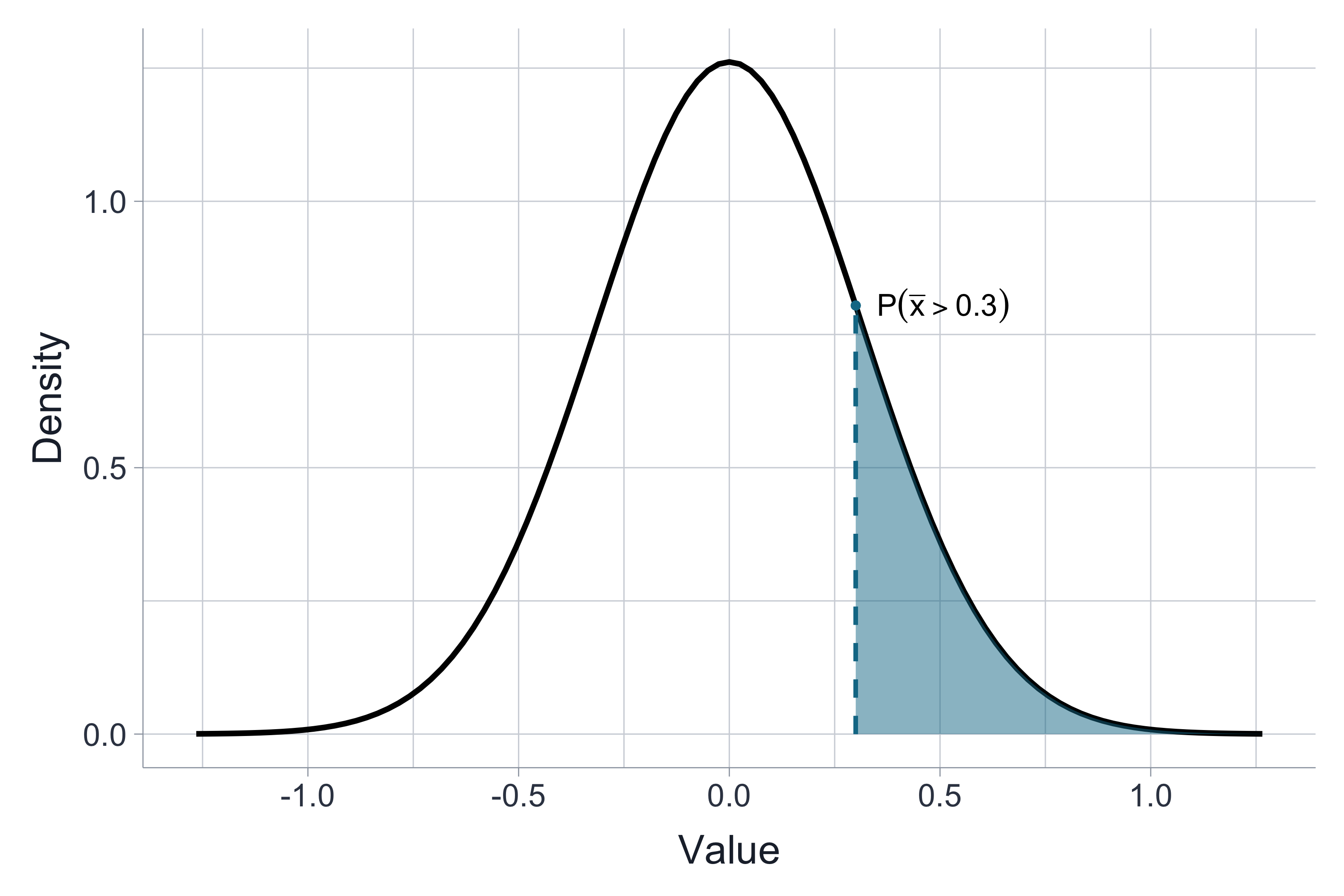 ## [1] 0.1713909This says that if the true population mean is μ=0, then 17% of the time we would expect to see a sample mean greater than 0.3, 17% of the time.