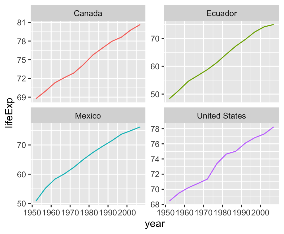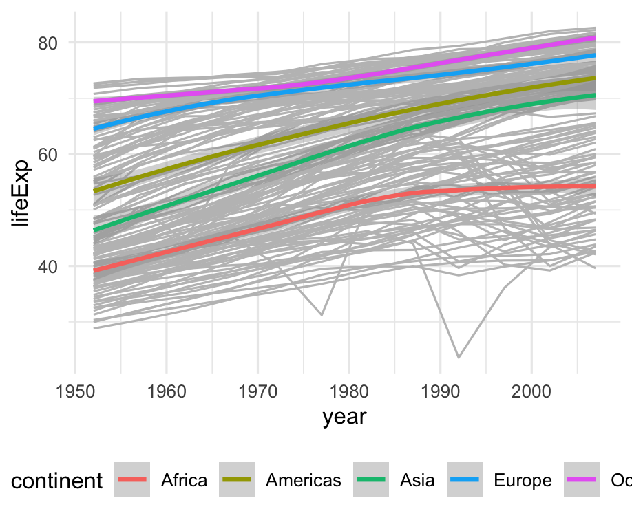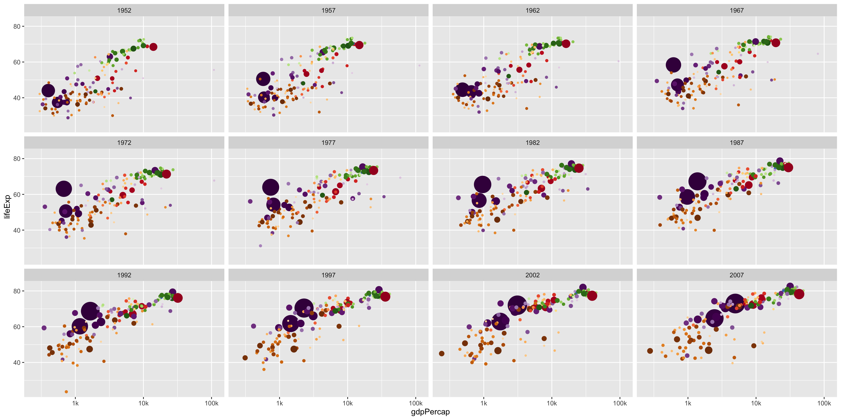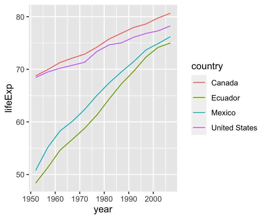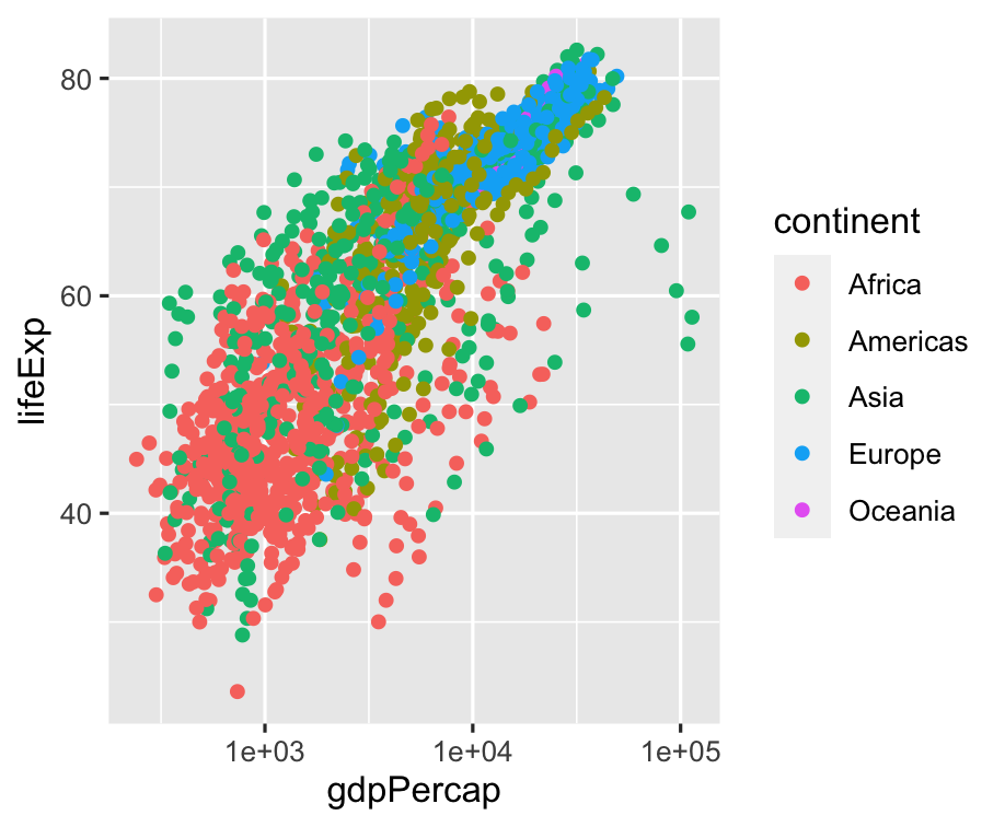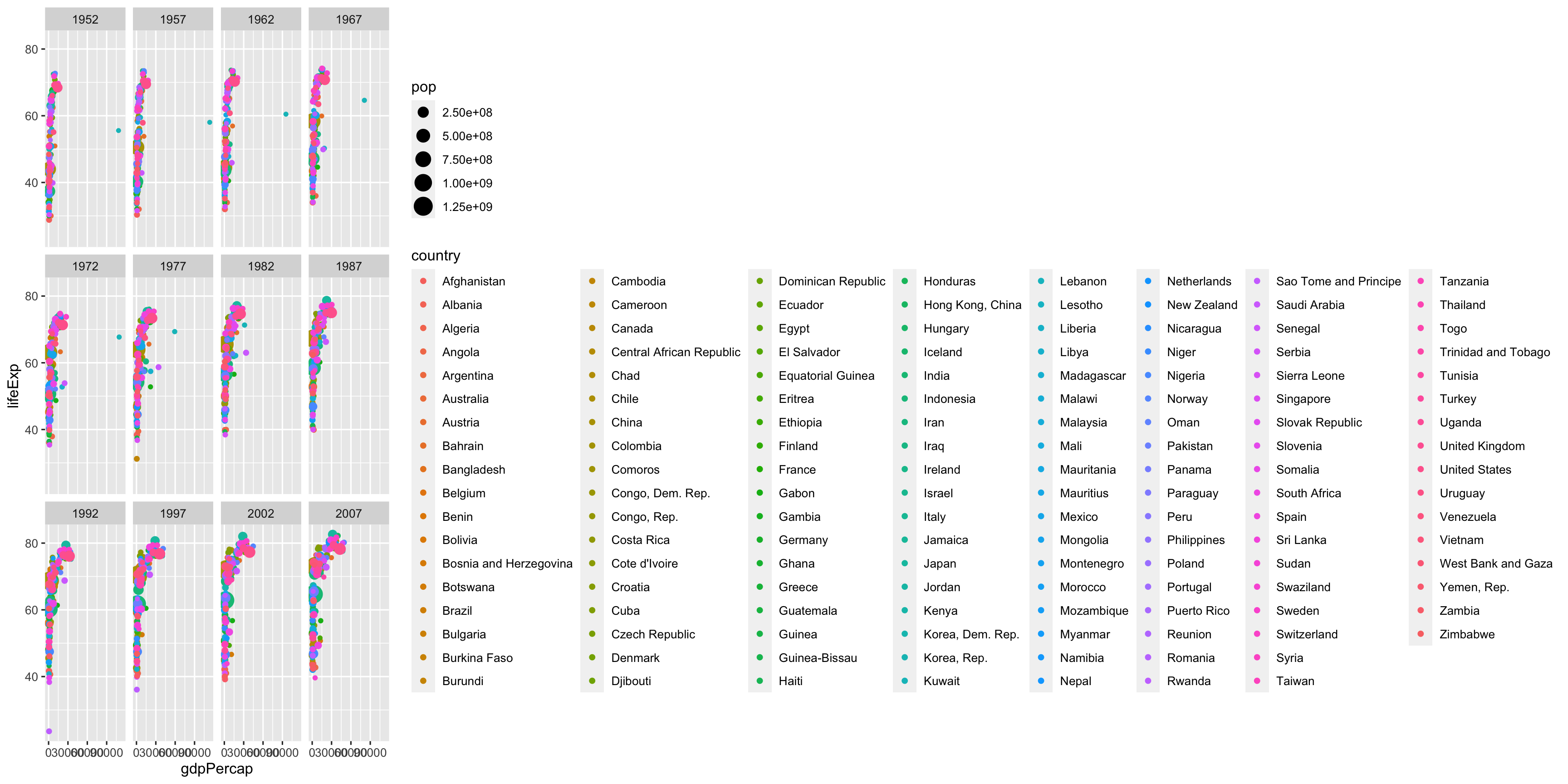 ] .institute[ ### Univeristy of New Haven ] .date[ ### 2023-09-28 (updated: 2023-10-02) ] --- class: center, middle, sydney-blue # Data Visualization using ggplot2 --- class: middle > “The simple graph has brought more information to the data analyst’s mind than any other device.” <br> <br> --- John Tukey --- ## A Brief History Based on [The Grammar of Graphics](https://smile.amazon.com/Grammar-Graphics-Statistics-Computing/dp/0387245448) by Leland Wilkinson (2000). ggplot releases: + [ggplot1](https://github.com/hadley/ggplot1) was released in April, 2006. + __Do NOT use this release.__ + Hadley uses it as a guide for API design in R. + [ggplot2](https://github.com/tidyverse/ggplot2) was released in June, 2007. + Feature freeze in February 2014. + The official extension mechanism was added in December 2015. --- ## The Layered Grammar of Graphics If you're interested in the theoretical underpinnings of ggplot2: <p> [The Layered Grammar of Graphics](https://vita.had.co.nz/papers/layered-grammar.html) by Hadley Wickham (2010). + Contrasts the ggplot2 approach with the earlier approach by Wilkenson + Introduces the concept of layers + Added to the existing R programming language --- ## The Benefits of using a Grammar > “A grammar of graphics is a tool that enables us to concisely describe the components of a graphic.” <br> <br> --- Hadley Wickham The most important reason is the grammar: + The MIT "language gives us power over problems" approach to problem solving + See relationships between graphs, components and data that might not be obvious otherwise + A higher level of abstraction than pen and paper approaches + Provides a concise way of thinking about the connection between data and graphs --- ## Why Should I use ggplot2? + Charts are more elegant than those found in base R + Well supported; Provides a wide variety of charts and themes + Well designed API (OOP plus FP plus DSL) + Building charts in layers is quite intuitive > **“The transferrable skills from ggplot2 are not the idiosyncracies of plotting syntax, but a powerful way of thinking about visualisation, as a way of** mapping between variables and the visual properties of geometric objects **that you can perceive.”** <br> <br> **--- Hadley Wickham** --- ## Why Should I use ggplot2? ### My personal reasons - .hl[Functional] data visualization 1. Wrangle data 2. Map data to visual elements 3. Tweak scales, guides, axis, labels, theme - Easy to .hl[reason] about how data drives visualization - Easy to .hl[iterate] - Easy to be .hl[consistent] ### .hl[Plus:] **stunning figures** --- layout: true ## G is for getting started --- ### Load the tidyverse ```r library(tidyverse) ``` ``` ## ── Attaching core tidyverse packages ────────────────────────────────── tidyverse 2.0.0 ── ## ✔ dplyr 1.1.3 ✔ readr 2.1.4 ## ✔ forcats 1.0.0 ✔ stringr 1.5.0 ## ✔ ggplot2 3.4.3 ✔ tibble 3.2.1 ## ✔ lubridate 1.9.2 ✔ tidyr 1.3.0 ## ✔ purrr 1.0.2 ## ── Conflicts ──────────────────────────────────────────────────── tidyverse_conflicts() ── ## ✖ dplyr::filter() masks stats::filter() ## ✖ dplyr::lag() masks stats::lag() ## ℹ Use the conflicted package (<http://conflicted.r-lib.org/>) to force all conflicts to become errors ``` --- ### Other packages you'll need for this adventure We'll use an excerpt of the [gapminder](http://www.gapminder.org/data/) dataset provided by the [`gapminder` package](https://github.com/jennybc/gapminder) by Jenny Bryan. <https://github.com/jennybc/gapminder> ```r ## install.packages("gapminder") library(gapminder) ``` --- layout: false class: inverse center middle text-white .font200[gg is for<br>Grammar of Graphics] --- ## What is a grammar of graphics? .left-code[ "Good grammar is just the first step in creating a good sentence." #### How is the drawing on the right connected to data? .footnote[<http://vita.had.co.nz/papers/layered-grammar.pdf>] ] .right-plot[ <img src="6-Visualization-with-ggplot_files/figure-html/guess-data-from-plot-0-1.png" width="100%" /> ] --- layout: true ## Guess the data behind this plot? .left-code[ ### MPG Ratings of Cars - Manufacturer - Car Type (Class) - City MPG - Highway MPG ] --- .right-plot[ <img src="6-Visualization-with-ggplot_files/figure-html/guess-data-from-plot-2-1.png" width="100%" /> ] --- .right-plot[ <img src="6-Visualization-with-ggplot_files/figure-html/guess-data-from-plot-3-1.png" width="100%" /> ] --- .right-plot[ <img src="6-Visualization-with-ggplot_files/figure-html/guess-data-from-plot-1-1.png" width="100%" /> ] --- .right-plot[ <img src="6-Visualization-with-ggplot_files/figure-html/guess-data-from-plot-4-1.png" width="100%" /> ] --- .right-plot[ <img src="6-Visualization-with-ggplot_files/figure-html/guess-data-from-plot-5-1.png" width="100%" /> ] --- .right-plot[ <img src="6-Visualization-with-ggplot_files/figure-html/guess-data-from-plot-6-1.png" width="100%" /> ] --- .right-plot[ <table> <thead> <tr> <th style="text-align:left;"> manufacturer </th> <th style="text-align:left;"> class </th> <th style="text-align:right;"> cty </th> <th style="text-align:right;"> hwy </th> <th style="text-align:left;"> model </th> </tr> </thead> <tbody> <tr> <td style="text-align:left;"> audi </td> <td style="text-align:left;"> compact </td> <td style="text-align:right;"> 21 </td> <td style="text-align:right;"> 30 </td> <td style="text-align:left;"> a4 </td> </tr> <tr> <td style="text-align:left;"> audi </td> <td style="text-align:left;"> compact </td> <td style="text-align:right;"> 17 </td> <td style="text-align:right;"> 25 </td> <td style="text-align:left;"> a4 quattro </td> </tr> <tr> <td style="text-align:left;"> ford </td> <td style="text-align:left;"> suv </td> <td style="text-align:right;"> 12 </td> <td style="text-align:right;"> 18 </td> <td style="text-align