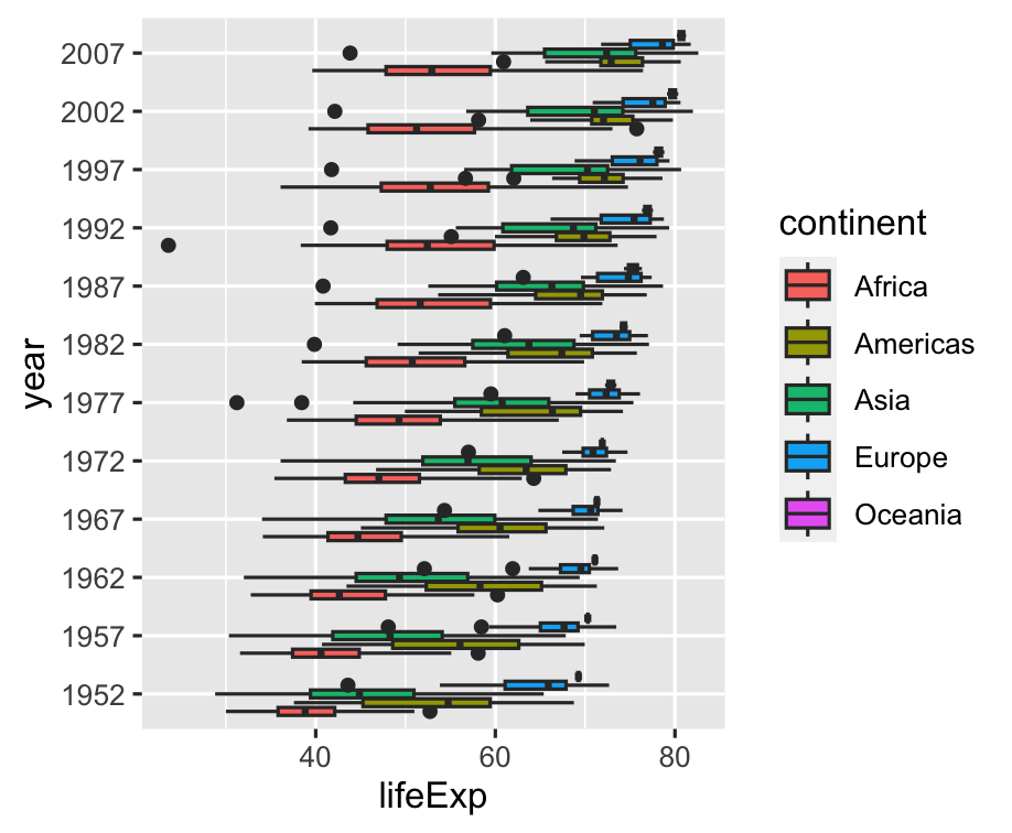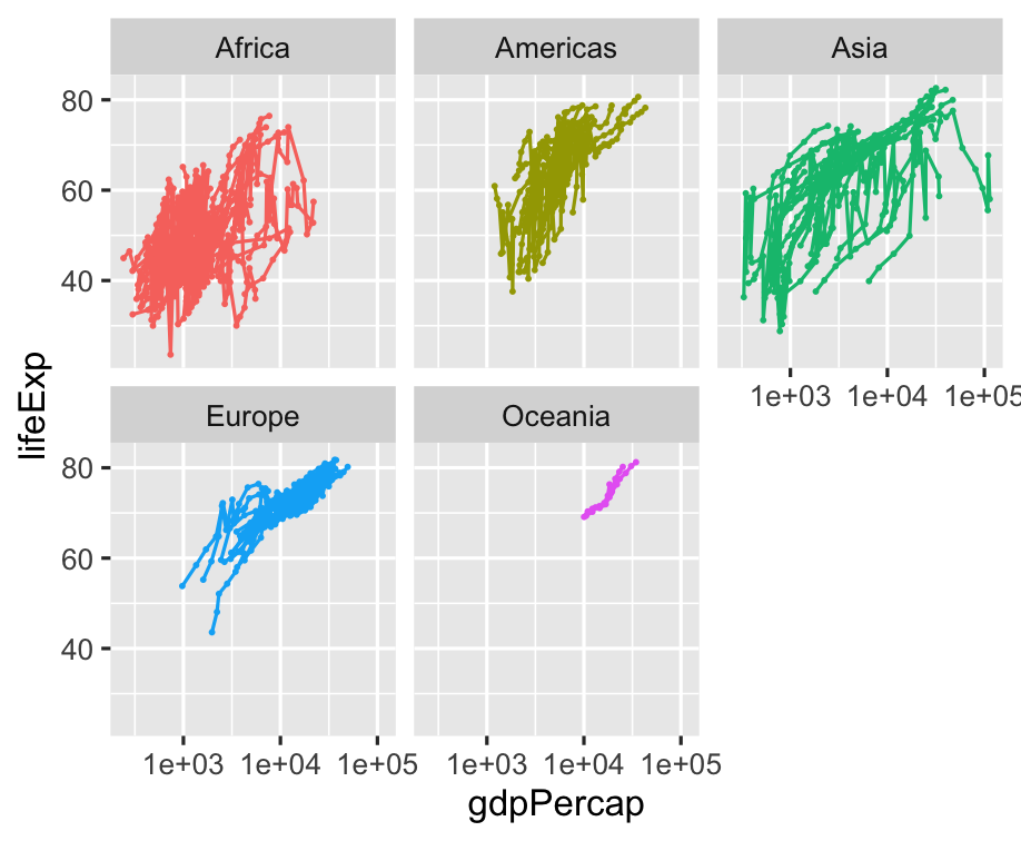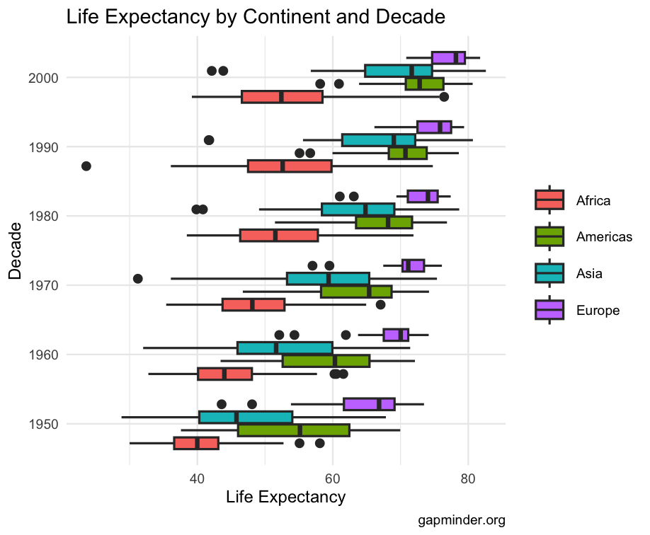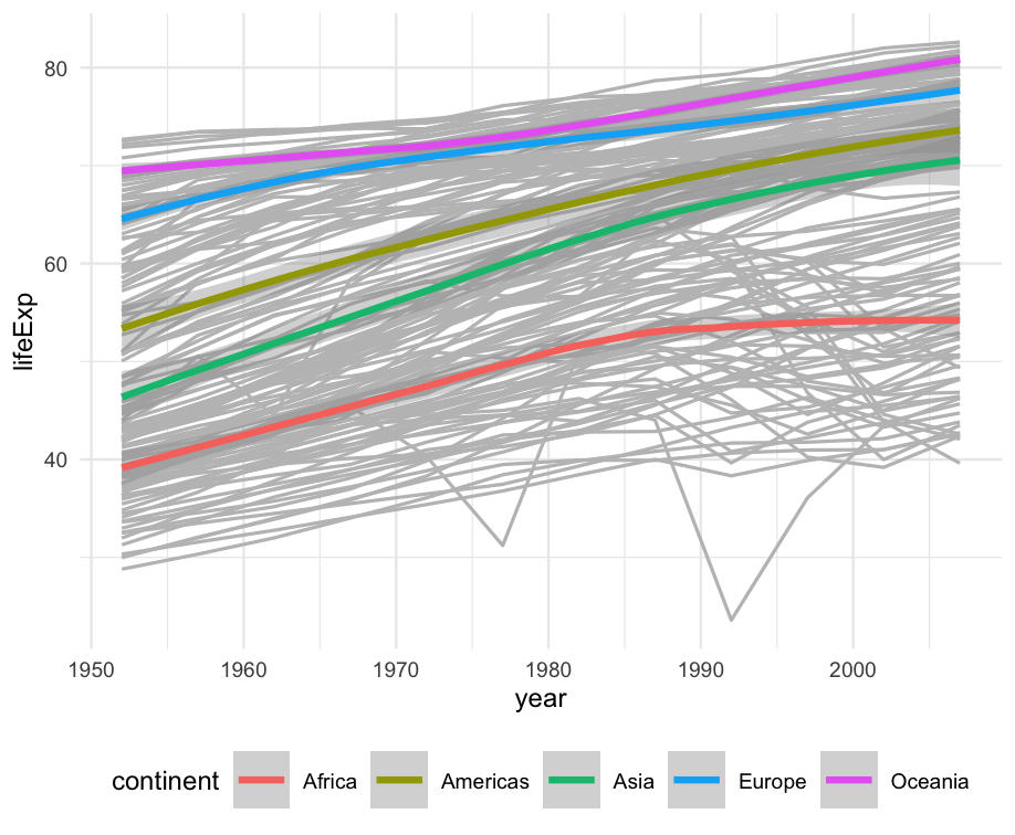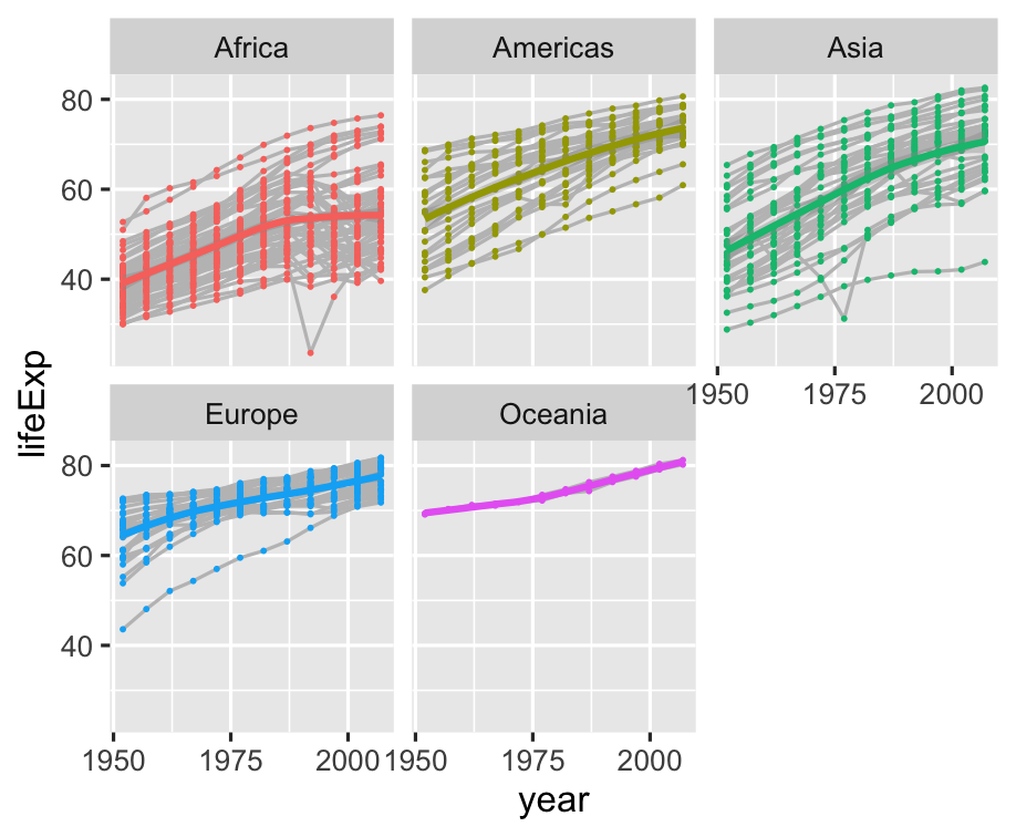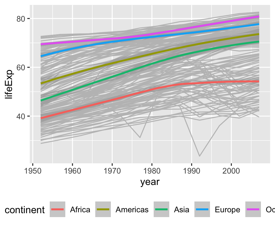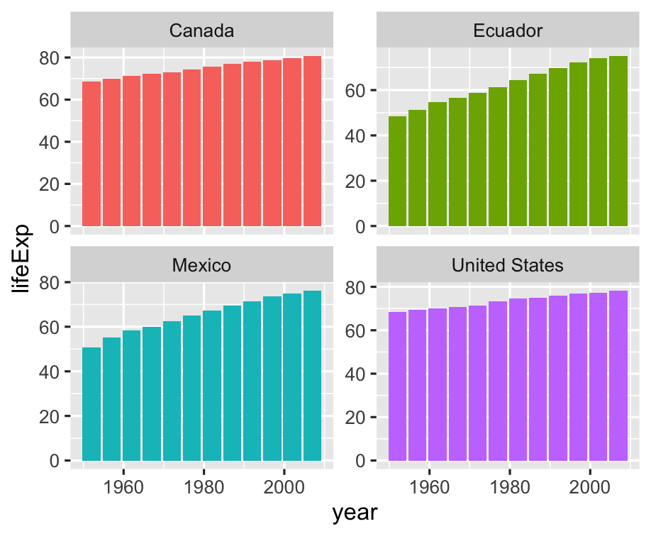 ] .institute[ ### Univeristy of New Haven ] .date[ ### 2023-09-28 (updated: 2023-10-02) ] --- class: center, middle, sydney-blue # Data Visualization using ggplot2 --- class: middle > “The simple graph has brought more information to the data analyst’s mind than any other device.” <br> <br> --- John Tukey --- ## A Brief History Based on [The Grammar of Graphics](https://smile.amazon.com/Grammar-Graphics-Statistics-Computing/dp/0387245448) by Leland Wilkinson (2000). ggplot releases: + [ggplot1](https://github.com/hadley/ggplot1) was released in April, 2006. + __Do NOT use this release.__ + Hadley uses it as a guide for API design in R. + [ggplot2](https://github.com/tidyverse/ggplot2) was released in June, 2007. + Feature freeze in February 2014. + The official extension mechanism was added in December 2015. --- ## The Layered Grammar of Graphics If you're interested in the theoretical underpinnings of ggplot2: <p> [The Layered Grammar of Graphics](https://vita.had.co.nz/papers/layered-grammar.html) by Hadley Wickham (2010). + Contrasts the ggplot2 approach with the earlier approach by Wilkenson + Introduces the concept of layers + Added to the existing R programming language --- ## The Benefits of using a Grammar > “A grammar of graphics is a tool that enables us to concisely describe the components of a graphic.” <br> <br> --- Hadley Wickham The most important reason is the grammar: + The MIT "language gives us power over problems" approach to problem solving + See relationships between graphs, components and data that might not be obvious otherwise + A higher level of abstraction than pen and paper approaches + Provides a concise way of thinking about the connection between data and graphs --- ## Why Should I use ggplot2? + Charts are more elegant than those found in base R + Well supported; Provides a wide variety of charts and themes + Well designed API (OOP plus FP plus DSL) + Building charts in layers is quite intuitive > **“The transferrable skills from ggplot2 are not the idiosyncracies of plotting syntax, but a powerful way of thinking about visualisation, as a way of** mapping between variables and the visual properties of geometric objects **that you can perceive.”** <br> <br> **--- Hadley Wickham** --- ## Why Should I use ggplot2? ### My personal reasons - .hl[Functional] data visualization 1. Wrangle data 2. Map data to visual elements 3. Tweak scales, guides, axis, labels, theme - Easy to .hl[reason] about how data drives visualization - Easy to .hl[iterate] - Easy to be .hl[consistent] ### .hl[Plus:] **stunning figures** --- layout: true ## G is for getting started --- ### Load the tidyverse ```r library(tidyverse) ``` ``` ## ── Attaching core tidyverse packages ────────────────────────────────── tidyverse 2.0.0 ── ## ✔ dplyr 1.1.3 ✔ readr 2.1.4 ## ✔ forcats 1.0.0 ✔ stringr 1.5.0 ## ✔ ggplot2 3.4.3 ✔ tibble 3.2.1 ## ✔ lubridate 1.9.2 ✔ tidyr 1.3.0 ## ✔ purrr 1.0.2 ## ── Conflicts ──────────────────────────────────────────────────── tidyverse_conflicts() ── ## ✖ dplyr::filter() masks stats::filter() ## ✖ dplyr::lag() masks stats::lag() ## ℹ Use the conflicted package (<http://conflicted.r-lib.org/>) to force all conflicts to become errors ``` --- ### Other packages you'll need for this adventure We'll use an excerpt of the [gapminder](http://www.gapminder.org/data/) dataset provided by the [`gapminder` package](https://github.com/jennybc/gapminder) by Jenny Bryan. <https://github.com/jennybc/gapminder> ```r ## install.packages("gapminder") library(gapminder) ``` --- layout: false class: inverse center middle text-white .font200[gg is for<br>Grammar of Graphics] --- ## What is a grammar of graphics? .left-code[ "Good grammar is just the first step in creating a good sentence." #### How is the drawing on the right connected to data? .footnote[<http://vita.had.co.nz/papers/layered-grammar.pdf>] ] .right-plot[ <img src="6-Visualization-with-ggplot_files/figure-html/guess-data-from-plot-0-1.png" width="100%" /> ] --- layout: true ## Guess the data behind this plot? .left-code[ ### MPG Ratings of Cars - Manufacturer - Car Type (Class) - City MPG - Highway MPG ] --- .right-plot[ <img src="6-Visualization-with-ggplot_files/figure-html/guess-data-from-plot-2-1.png" width="100%" /> ] --- .right-plot[ <img src="6-Visualization-with-ggplot_files/figure-html/guess-data-from-plot-3-1.png" width="100%" /> ] --- .right-plot[ <img src="6-Visualization-with-ggplot_files/figure-html/guess-data-from-plot-1-1.png" width="100%" /> ] --- .right-plot[ <img src="6-Visualization-with-ggplot_files/figure-html/guess-data-from-plot-4-1.png" width="100%" /> ] --- .right-plot[ <img src="6-Visualization-with-ggplot_files/figure-html/guess-data-from-plot-5-1.png" width="100%" /> ] --- .right-plot[ <img src="6-Visualization-with-ggplot_files/figure-html/guess-data-from-plot-6-1.png" width="100%" /> ] --- .right-plot[ <table> <thead> <tr> <th style="text-align:left;"> manufacturer </th> <th style="text-align:left;"> class </th> <th style="text-align:right;"> cty </th> <th style="text-align:right;"> hwy </th> <th style="text-align:left;"> model </th> </tr> </thead> <tbody> <tr> <td style="text-align:left;"> audi </td> <td style="text-align:left;"> compact </td> <td style="text-align:right;"> 21 </td> <td style="text-align:right;"> 30 </td> <td style="text-align:left;"> a4 </td> </tr> <tr> <td style="text-align:left;"> audi </td> <td style="text-align:left;"> compact </td> <td style="text-align:right;"> 17 </td> <td style="text-align:right;"> 25 </td> <td style="text-align:left;"> a4 quattro </td> </tr> <tr> <td style="text-align:left;"> ford </td> <td style="text-align:left;"> suv </td> <td style="text-align:right;"> 12 </td> <td style="text-align:right;"> 18 </td> <td style="text-align