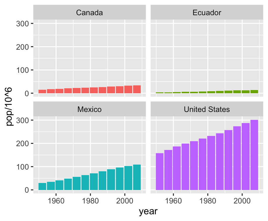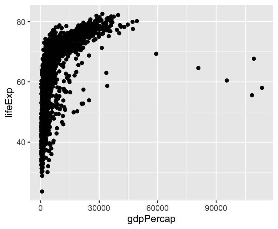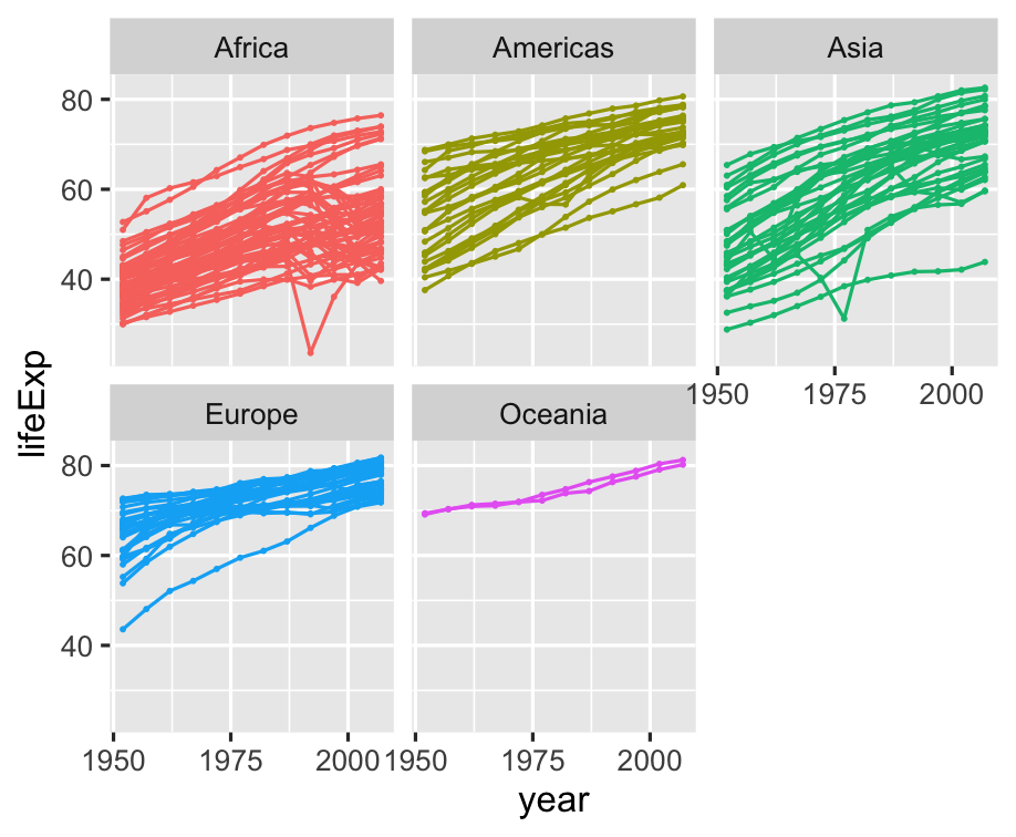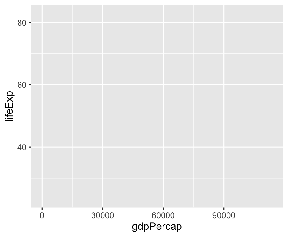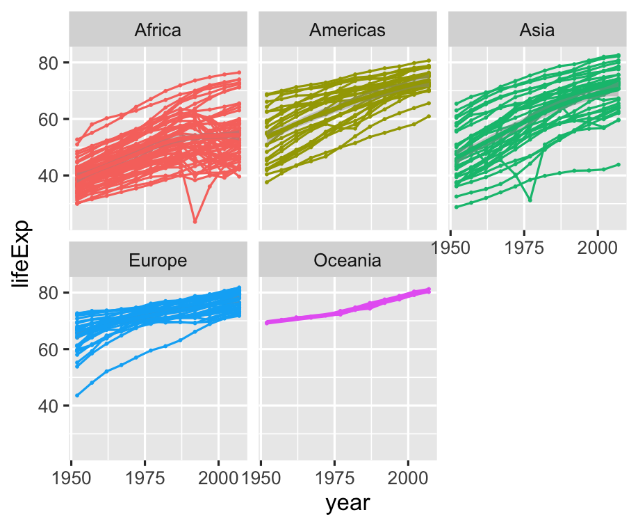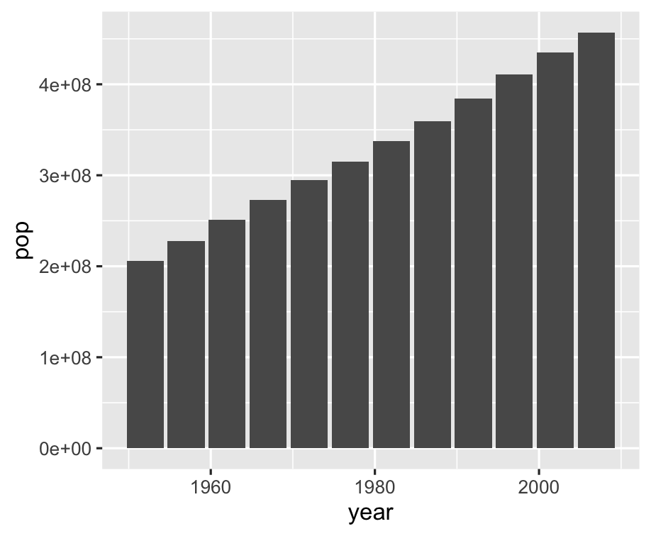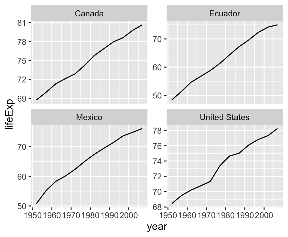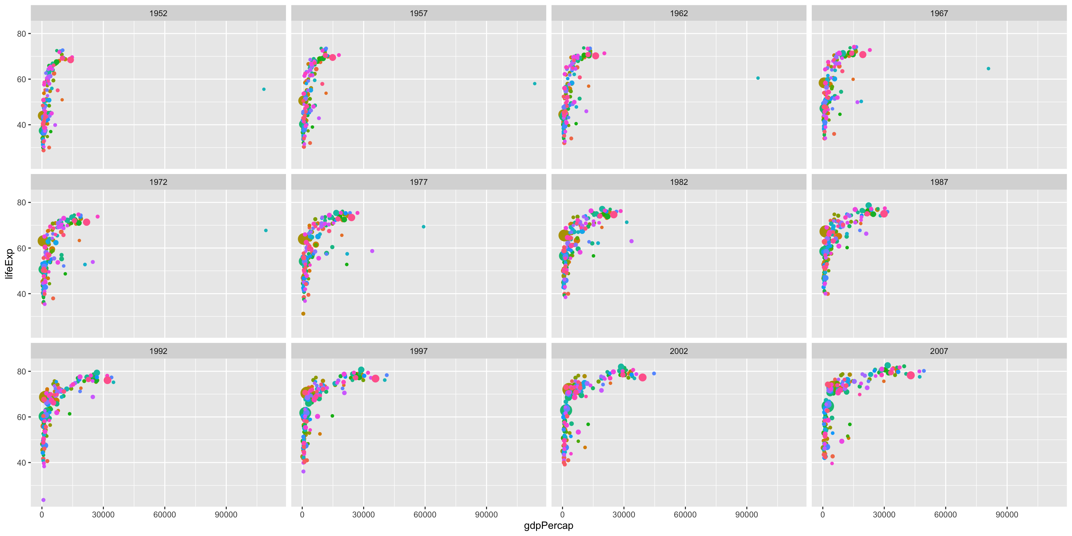 ] .institute[ ### Univeristy of New Haven ] .date[ ### 2023-09-28 (updated: 2023-10-02) ] --- class: center, middle, sydney-blue # Data Visualization using ggplot2 --- class: middle > “The simple graph has brought more information to the data analyst’s mind than any other device.” <br> <br> --- John Tukey --- ## A Brief History Based on [The Grammar of Graphics](https://smile.amazon.com/Grammar-Graphics-Statistics-Computing/dp/0387245448) by Leland Wilkinson (2000). ggplot releases: + [ggplot1](https://github.com/hadley/ggplot1) was released in April, 2006. + __Do NOT use this release.__ + Hadley uses it as a guide for API design in R. + [ggplot2](https://github.com/tidyverse/ggplot2) was released in June, 2007. + Feature freeze in February 2014. + The official extension mechanism was added in December 2015. --- ## The Layered Grammar of Graphics If you're interested in the theoretical underpinnings of ggplot2: <p> [The Layered Grammar of Graphics](https://vita.had.co.nz/papers/layered-grammar.html) by Hadley Wickham (2010). + Contrasts the ggplot2 approach with the earlier approach by Wilkenson + Introduces the concept of layers + Added to the existing R programming language --- ## The Benefits of using a Grammar > “A grammar of graphics is a tool that enables us to concisely describe the components of a graphic.” <br> <br> --- Hadley Wickham The most important reason is the grammar: + The MIT "language gives us power over problems" approach to problem solving + See relationships between graphs, components and data that might not be obvious otherwise + A higher level of abstraction than pen and paper approaches + Provides a concise way of thinking about the connection between data and graphs --- ## Why Should I use ggplot2? + Charts are more elegant than those found in base R + Well supported; Provides a wide variety of charts and themes + Well designed API (OOP plus FP plus DSL) + Building charts in layers is quite intuitive > **“The transferrable skills from ggplot2 are not the idiosyncracies of plotting syntax, but a powerful way of thinking about visualisation, as a way of** mapping between variables and the visual properties of geometric objects **that you can perceive.”** <br> <br> **--- Hadley Wickham** --- ## Why Should I use ggplot2? ### My personal reasons - .hl[Functional] data visualization 1. Wrangle data 2. Map data to visual elements 3. Tweak scales, guides, axis, labels, theme - Easy to .hl[reason] about how data drives visualization - Easy to .hl[iterate] - Easy to be .hl[consistent] ### .hl[Plus:] **stunning figures** --- layout: true ## G is for getting started --- ### Load the tidyverse ```r library(tidyverse) ``` ``` ## ── Attaching core tidyverse packages ────────────────────────────────── tidyverse 2.0.0 ── ## ✔ dplyr 1.1.3 ✔ readr 2.1.4 ## ✔ forcats 1.0.0 ✔ stringr 1.5.0 ## ✔ ggplot2 3.4.3 ✔ tibble 3.2.1 ## ✔ lubridate 1.9.2 ✔ tidyr 1.3.0 ## ✔ purrr 1.0.2 ## ── Conflicts ──────────────────────────────────────────────────── tidyverse_conflicts() ── ## ✖ dplyr::filter() masks stats::filter() ## ✖ dplyr::lag() masks stats::lag() ## ℹ Use the conflicted package (<http://conflicted.r-lib.org/>) to force all conflicts to become errors ``` --- ### Other packages you'll need for this adventure We'll use an excerpt of the [gapminder](http://www.gapminder.org/data/) dataset provided by the [`gapminder` package](https://github.com/jennybc/gapminder) by Jenny Bryan. <https://github.com/jennybc/gapminder> ```r ## install.packages("gapminder") library(gapminder) ``` --- layout: false class: inverse center middle text-white .font200[gg is for<br>Grammar of Graphics] --- ## What is a grammar of graphics? .left-code[ "Good grammar is just the first step in creating a good sentence." #### How is the drawing on the right connected to data? .footnote[<http://vita.had.co.nz/papers/layered-grammar.pdf>] ] .right-plot[ <img src="6-Visualization-with-ggplot_files/figure-html/guess-data-from-plot-0-1.png" width="100%" /> ] --- layout: true ## Guess the data behind this plot? .left-code[ ### MPG Ratings of Cars - Manufacturer - Car Type (Class) - City MPG - Highway MPG ] --- .right-plot[ <img src="6-Visualization-with-ggplot_files/figure-html/guess-data-from-plot-2-1.png" width="100%" /> ] --- .right-plot[ <img src="6-Visualization-with-ggplot_files/figure-html/guess-data-from-plot-3-1.png" width="100%" /> ] --- .right-plot[ <img src="6-Visualization-with-ggplot_files/figure-html/guess-data-from-plot-1-1.png" width="100%" /> ] --- .right-plot[ <img src="6-Visualization-with-ggplot_files/figure-html/guess-data-from-plot-4-1.png" width="100%" /> ] --- .right-plot[ <img src="6-Visualization-with-ggplot_files/figure-html/guess-data-from-plot-5-1.png" width="100%" /> ] --- .right-plot[ <img src="6-Visualization-with-ggplot_files/figure-html/guess-data-from-plot-6-1.png" width="100%" /> ] --- .right-plot[ <table> <thead> <tr> <th style="text-align:left;"> manufacturer </th> <th style="text-align:left;"> class </th> <th style="text-align:right;"> cty </th> <th style="text-align:right;"> hwy </th> <th style="text-align:left;"> model </th> </tr> </thead> <tbody> <tr> <td style="text-align:left;"> audi </td> <td style="text-align:left;"> compact </td> <td style="text-align:right;"> 21 </td> <td style="text-align:right;"> 30 </td> <td style="text-align:left;"> a4 </td> </tr> <tr> <td style="text-align:left;"> audi </td> <td style="text-align:left;"> compact </td> <td style="text-align:right;"> 17 </td> <td style="text-align:right;"> 25 </td> <td style="text-align:left;"> a4 quattro </td> </tr> <tr> <td style="text-align:left;"> ford </td> <td style="text-align:left;"> suv </td> <td style="text-align:right;"> 12 </td> <td style="text-align:right;"> 18 </td> <td style="text-align