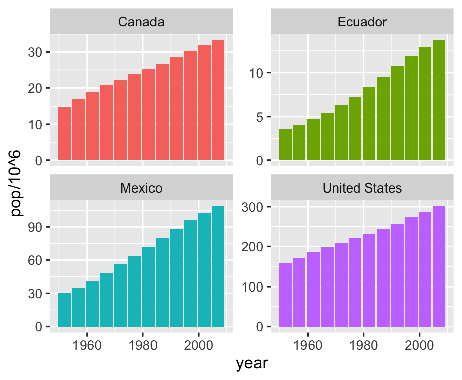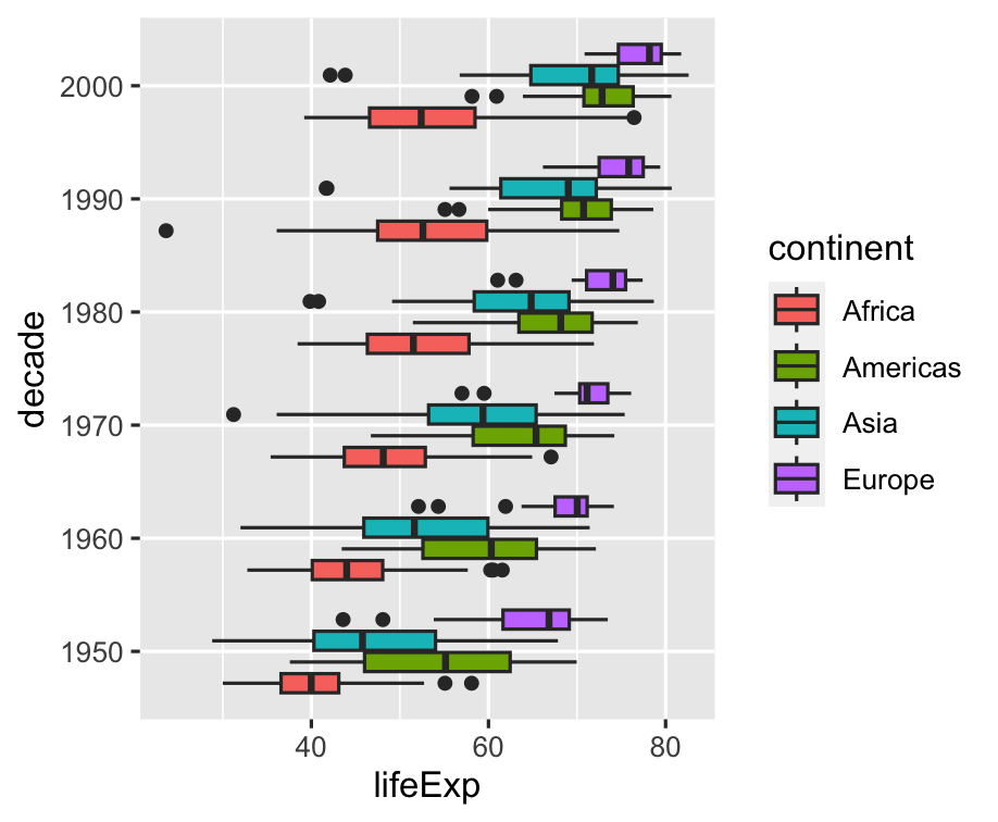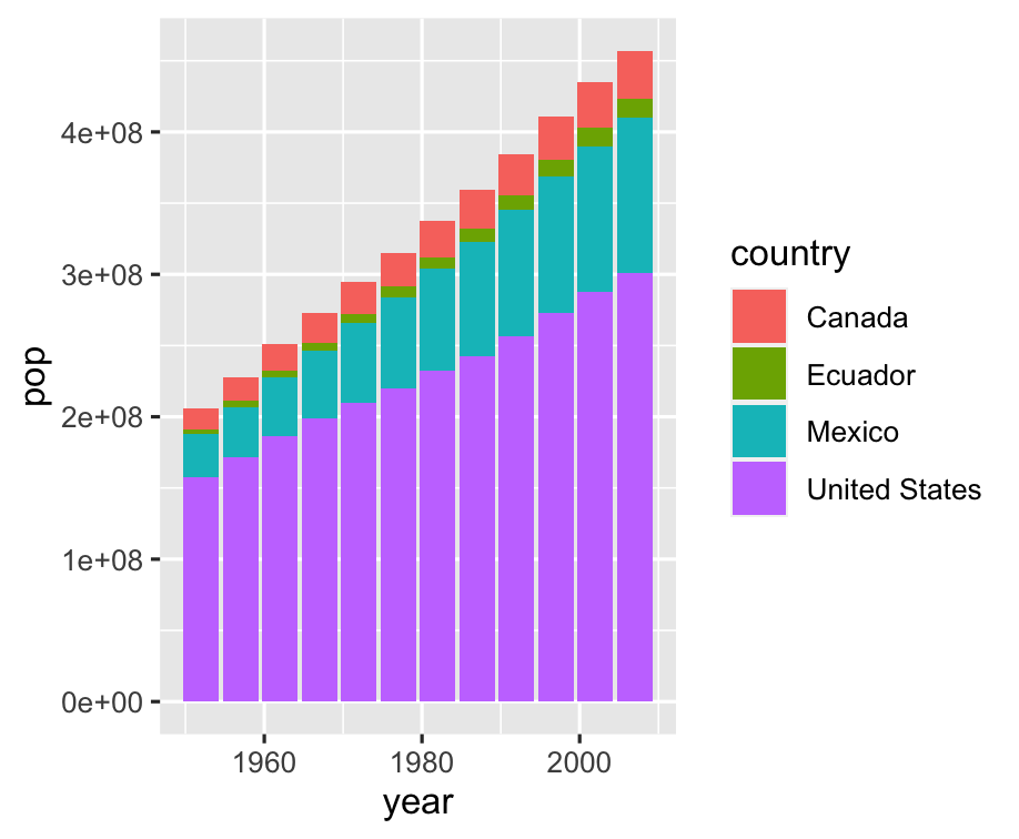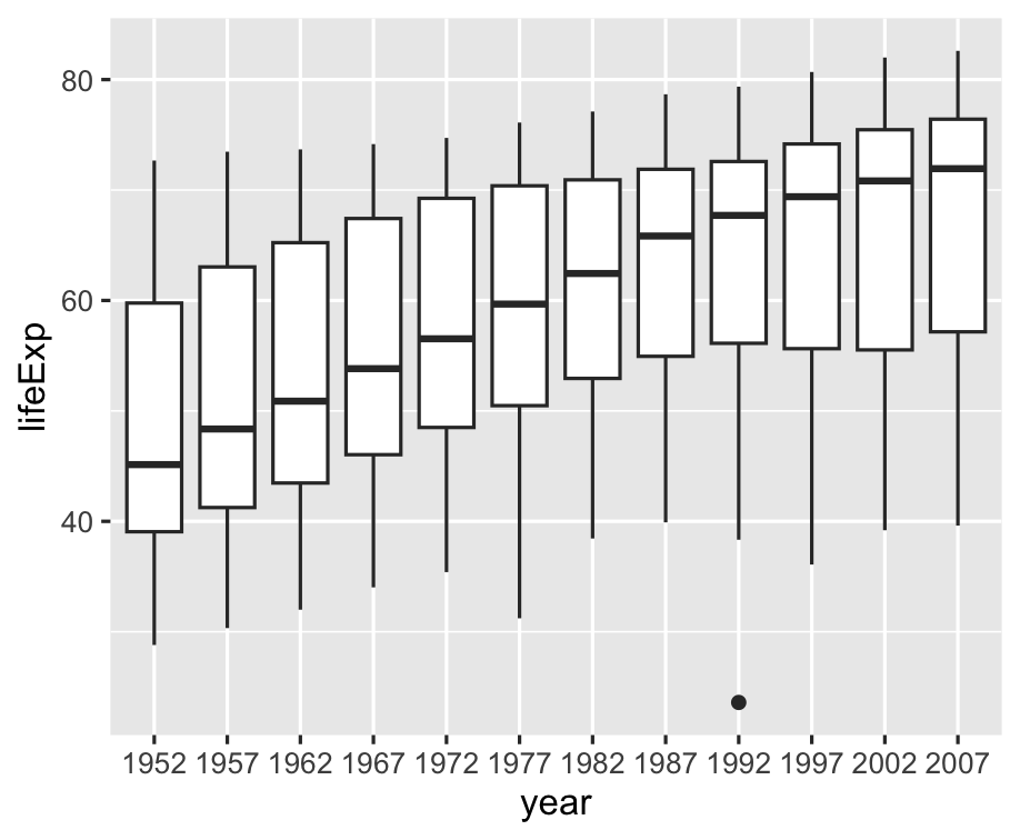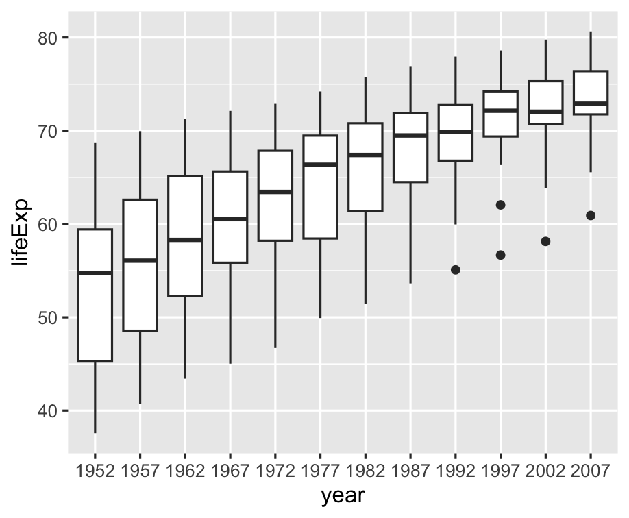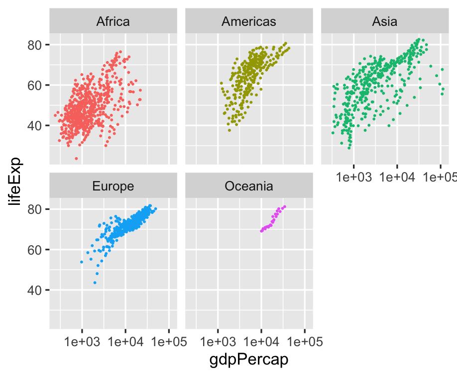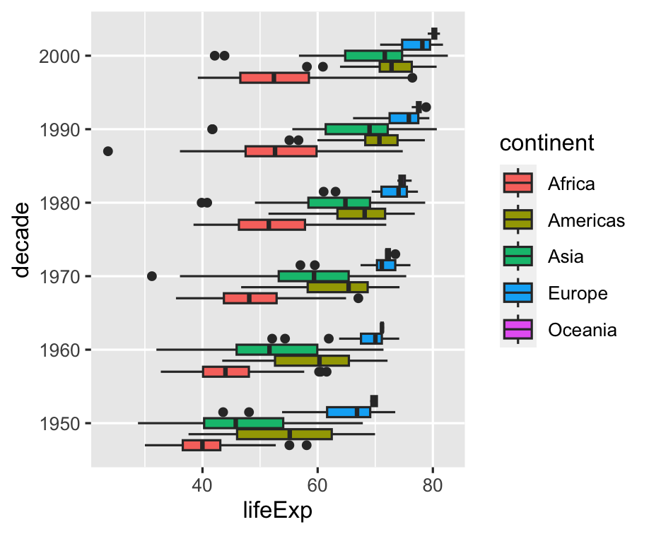 ] .institute[ ### Univeristy of New Haven ] .date[ ### 2023-09-28 (updated: 2023-10-02) ] --- class: center, middle, sydney-blue # Data Visualization using ggplot2 --- class: middle > “The simple graph has brought more information to the data analyst’s mind than any other device.” <br> <br> --- John Tukey --- ## A Brief History Based on [The Grammar of Graphics](https://smile.amazon.com/Grammar-Graphics-Statistics-Computing/dp/0387245448) by Leland Wilkinson (2000). ggplot releases: + [ggplot1](https://github.com/hadley/ggplot1) was released in April, 2006. + __Do NOT use this release.__ + Hadley uses it as a guide for API design in R. + [ggplot2](https://github.com/tidyverse/ggplot2) was released in June, 2007. + Feature freeze in February 2014. + The official extension mechanism was added in December 2015. --- ## The Layered Grammar of Graphics If you're interested in the theoretical underpinnings of ggplot2: <p> [The Layered Grammar of Graphics](https://vita.had.co.nz/papers/layered-grammar.html) by Hadley Wickham (2010). + Contrasts the ggplot2 approach with the earlier approach by Wilkenson + Introduces the concept of layers + Added to the existing R programming language --- ## The Benefits of using a Grammar > “A grammar of graphics is a tool that enables us to concisely describe the components of a graphic.” <br> <br> --- Hadley Wickham The most important reason is the grammar: + The MIT "language gives us power over problems" approach to problem solving + See relationships between graphs, components and data that might not be obvious otherwise + A higher level of abstraction than pen and paper approaches + Provides a concise way of thinking about the connection between data and graphs --- ## Why Should I use ggplot2? + Charts are more elegant than those found in base R + Well supported; Provides a wide variety of charts and themes + Well designed API (OOP plus FP plus DSL) + Building charts in layers is quite intuitive > **“The transferrable skills from ggplot2 are not the idiosyncracies of plotting syntax, but a powerful way of thinking about visualisation, as a way of** mapping between variables and the visual properties of geometric objects **that you can perceive.”** <br> <br> **--- Hadley Wickham** --- ## Why Should I use ggplot2? ### My personal reasons - .hl[Functional] data visualization 1. Wrangle data 2. Map data to visual elements 3. Tweak scales, guides, axis, labels, theme - Easy to .hl[reason] about how data drives visualization - Easy to .hl[iterate] - Easy to be .hl[consistent] ### .hl[Plus:] **stunning figures** --- layout: true ## G is for getting started --- ### Load the tidyverse ```r library(tidyverse) ``` ``` ## ── Attaching core tidyverse packages ────────────────────────────────── tidyverse 2.0.0 ── ## ✔ dplyr 1.1.3 ✔ readr 2.1.4 ## ✔ forcats 1.0.0 ✔ stringr 1.5.0 ## ✔ ggplot2 3.4.3 ✔ tibble 3.2.1 ## ✔ lubridate 1.9.2 ✔ tidyr 1.3.0 ## ✔ purrr 1.0.2 ## ── Conflicts ──────────────────────────────────────────────────── tidyverse_conflicts() ── ## ✖ dplyr::filter() masks stats::filter() ## ✖ dplyr::lag() masks stats::lag() ## ℹ Use the conflicted package (<http://conflicted.r-lib.org/>) to force all conflicts to become errors ``` --- ### Other packages you'll need for this adventure We'll use an excerpt of the [gapminder](http://www.gapminder.org/data/) dataset provided by the [`gapminder` package](https://github.com/jennybc/gapminder) by Jenny Bryan. <https://github.com/jennybc/gapminder> ```r ## install.packages("gapminder") library(gapminder) ``` --- layout: false class: inverse center middle text-white .font200[gg is for<br>Grammar of Graphics] --- ## What is a grammar of graphics? .left-code[ "Good grammar is just the first step in creating a good sentence." #### How is the drawing on the right connected to data? .footnote[<http://vita.had.co.nz/papers/layered-grammar.pdf>] ] .right-plot[ <img src="6-Visualization-with-ggplot_files/figure-html/guess-data-from-plot-0-1.png" width="100%" /> ] --- layout: true ## Guess the data behind this plot? .left-code[ ### MPG Ratings of Cars - Manufacturer - Car Type (Class) - City MPG - Highway MPG ] --- .right-plot[ <img src="6-Visualization-with-ggplot_files/figure-html/guess-data-from-plot-2-1.png" width="100%" /> ] --- .right-plot[ <img src="6-Visualization-with-ggplot_files/figure-html/guess-data-from-plot-3-1.png" width="100%" /> ] --- .right-plot[ <img src="6-Visualization-with-ggplot_files/figure-html/guess-data-from-plot-1-1.png" width="100%" /> ] --- .right-plot[ <img src="6-Visualization-with-ggplot_files/figure-html/guess-data-from-plot-4-1.png" width="100%" /> ] --- .right-plot[ <img src="6-Visualization-with-ggplot_files/figure-html/guess-data-from-plot-5-1.png" width="100%" /> ] --- .right-plot[ <img src="6-Visualization-with-ggplot_files/figure-html/guess-data-from-plot-6-1.png" width="100%" /> ] --- .right-plot[ <table> <thead> <tr> <th style="text-align:left;"> manufacturer </th> <th style="text-align:left;"> class </th> <th style="text-align:right;"> cty </th> <th style="text-align:right;"> hwy </th> <th style="text-align:left;"> model </th> </tr> </thead> <tbody> <tr> <td style="text-align:left;"> audi </td> <td style="text-align:left;"> compact </td> <td style="text-align:right;"> 21 </td> <td style="text-align:right;"> 30 </td> <td style="text-align:left;"> a4 </td> </tr> <tr> <td style="text-align:left;"> audi </td> <td style="text-align:left;"> compact </td> <td style="text-align:right;"> 17 </td> <td style="text-align:right;"> 25 </td> <td style="text-align:left;"> a4 quattro </td> </tr> <tr> <td style="text-align:left;"> ford </td> <td style="text-align:left;"> suv </td> <td style="text-align:right;"> 12 </td> <td style="text-align:right;"> 18 </td> <td style="text-align