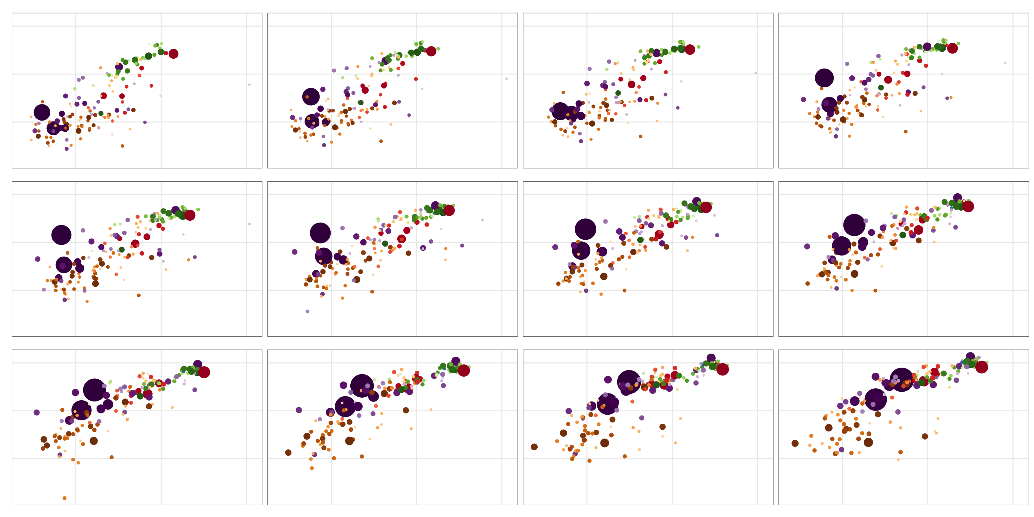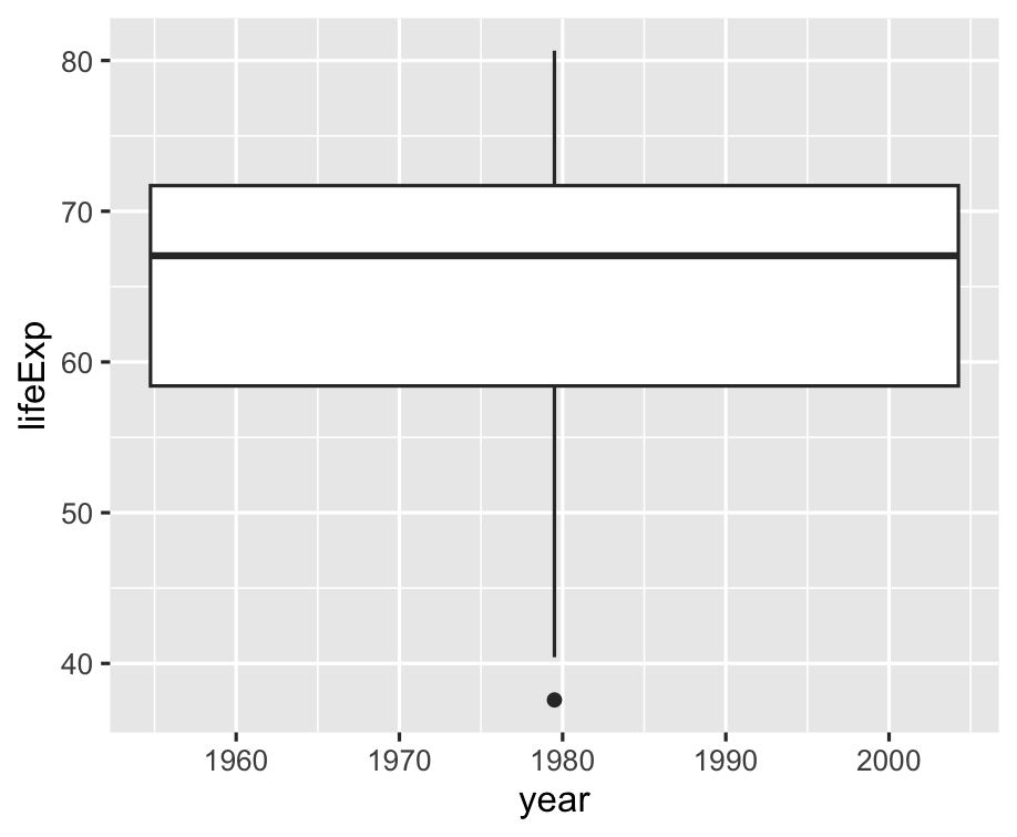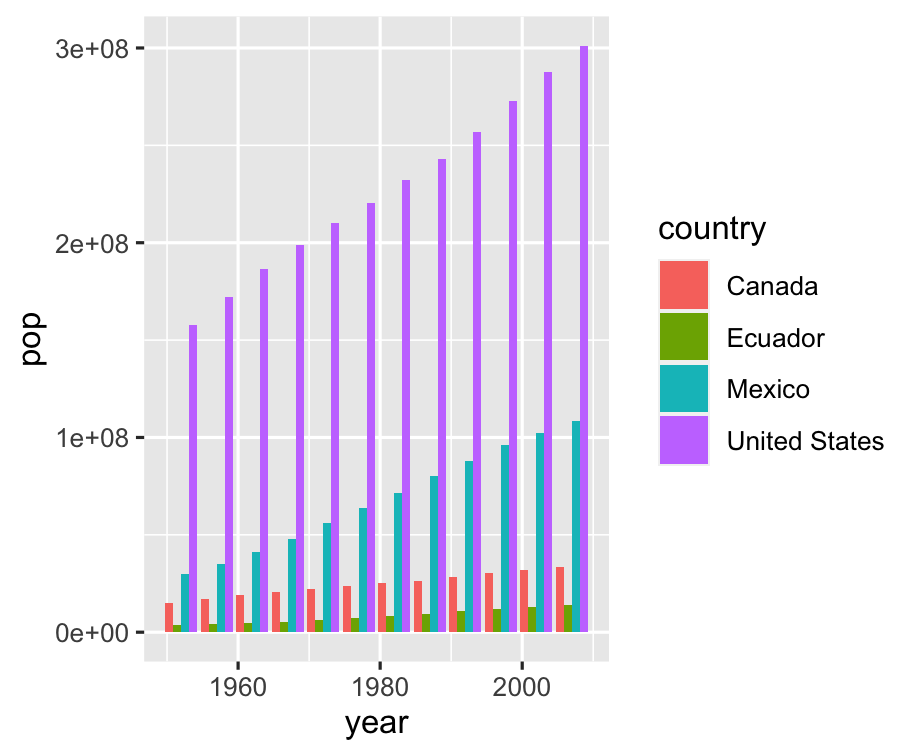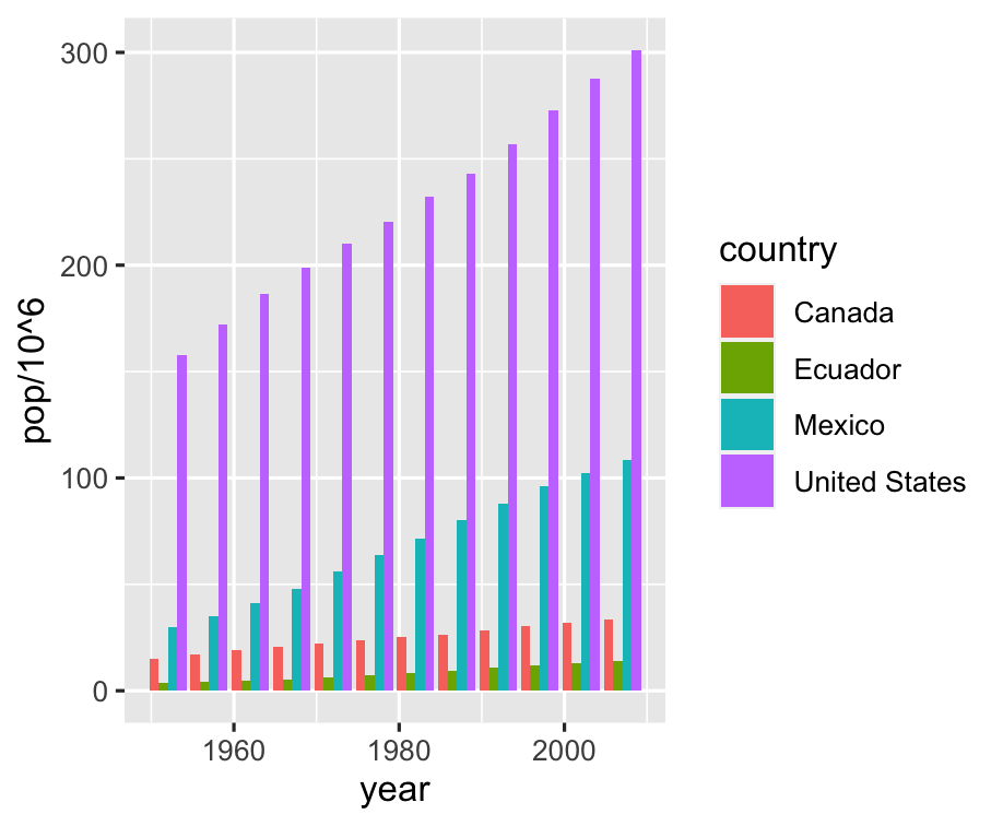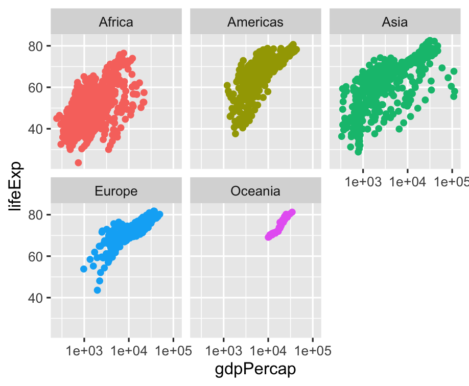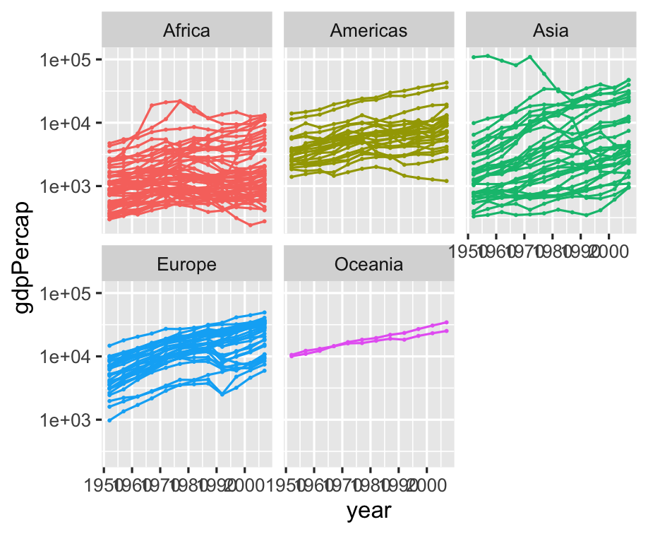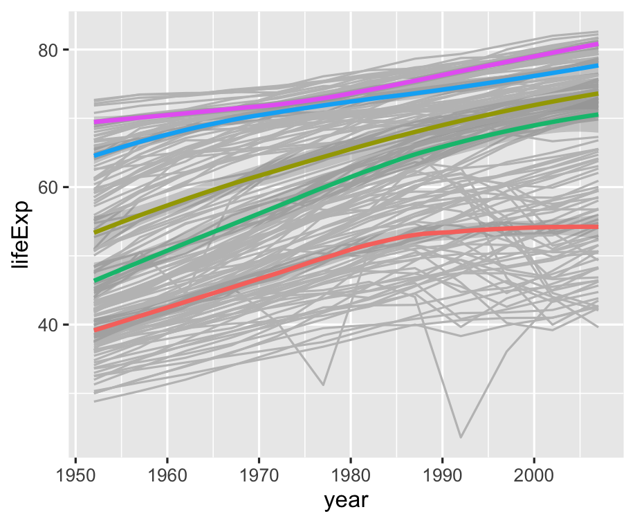 ] .institute[ ### Univeristy of New Haven ] .date[ ### 2023-09-28 (updated: 2023-10-02) ] --- class: center, middle, sydney-blue # Data Visualization using ggplot2 --- class: middle > “The simple graph has brought more information to the data analyst’s mind than any other device.” <br> <br> --- John Tukey --- ## A Brief History Based on [The Grammar of Graphics](https://smile.amazon.com/Grammar-Graphics-Statistics-Computing/dp/0387245448) by Leland Wilkinson (2000). ggplot releases: + [ggplot1](https://github.com/hadley/ggplot1) was released in April, 2006. + __Do NOT use this release.__ + Hadley uses it as a guide for API design in R. + [ggplot2](https://github.com/tidyverse/ggplot2) was released in June, 2007. + Feature freeze in February 2014. + The official extension mechanism was added in December 2015. --- ## The Layered Grammar of Graphics If you're interested in the theoretical underpinnings of ggplot2: <p> [The Layered Grammar of Graphics](https://vita.had.co.nz/papers/layered-grammar.html) by Hadley Wickham (2010). + Contrasts the ggplot2 approach with the earlier approach by Wilkenson + Introduces the concept of layers + Added to the existing R programming language --- ## The Benefits of using a Grammar > “A grammar of graphics is a tool that enables us to concisely describe the components of a graphic.” <br> <br> --- Hadley Wickham The most important reason is the grammar: + The MIT "language gives us power over problems" approach to problem solving + See relationships between graphs, components and data that might not be obvious otherwise + A higher level of abstraction than pen and paper approaches + Provides a concise way of thinking about the connection between data and graphs --- ## Why Should I use ggplot2? + Charts are more elegant than those found in base R + Well supported; Provides a wide variety of charts and themes + Well designed API (OOP plus FP plus DSL) + Building charts in layers is quite intuitive > **“The transferrable skills from ggplot2 are not the idiosyncracies of plotting syntax, but a powerful way of thinking about visualisation, as a way of** mapping between variables and the visual properties of geometric objects **that you can perceive.”** <br> <br> **--- Hadley Wickham** --- ## Why Should I use ggplot2? ### My personal reasons - .hl[Functional] data visualization 1. Wrangle data 2. Map data to visual elements 3. Tweak scales, guides, axis, labels, theme - Easy to .hl[reason] about how data drives visualization - Easy to .hl[iterate] - Easy to be .hl[consistent] ### .hl[Plus:] **stunning figures** --- layout: true ## G is for getting started --- ### Load the tidyverse ```r library(tidyverse) ``` ``` ## ── Attaching core tidyverse packages ────────────────────────────────── tidyverse 2.0.0 ── ## ✔ dplyr 1.1.3 ✔ readr 2.1.4 ## ✔ forcats 1.0.0 ✔ stringr 1.5.0 ## ✔ ggplot2 3.4.3 ✔ tibble 3.2.1 ## ✔ lubridate 1.9.2 ✔ tidyr 1.3.0 ## ✔ purrr 1.0.2 ## ── Conflicts ──────────────────────────────────────────────────── tidyverse_conflicts() ── ## ✖ dplyr::filter() masks stats::filter() ## ✖ dplyr::lag() masks stats::lag() ## ℹ Use the conflicted package (<http://conflicted.r-lib.org/>) to force all conflicts to become errors ``` --- ### Other packages you'll need for this adventure We'll use an excerpt of the [gapminder](http://www.gapminder.org/data/) dataset provided by the [`gapminder` package](https://github.com/jennybc/gapminder) by Jenny Bryan. <https://github.com/jennybc/gapminder> ```r ## install.packages("gapminder") library(gapminder) ``` --- layout: false class: inverse center middle text-white .font200[gg is for<br>Grammar of Graphics] --- ## What is a grammar of graphics? .left-code[ "Good grammar is just the first step in creating a good sentence." #### How is the drawing on the right connected to data? .footnote[<http://vita.had.co.nz/papers/layered-grammar.pdf>] ] .right-plot[ <img src="6-Visualization-with-ggplot_files/figure-html/guess-data-from-plot-0-1.png" width="100%" /> ] --- layout: true ## Guess the data behind this plot? .left-code[ ### MPG Ratings of Cars - Manufacturer - Car Type (Class) - City MPG - Highway MPG ] --- .right-plot[ <img src="6-Visualization-with-ggplot_files/figure-html/guess-data-from-plot-2-1.png" width="100%" /> ] --- .right-plot[ <img src="6-Visualization-with-ggplot_files/figure-html/guess-data-from-plot-3-1.png" width="100%" /> ] --- .right-plot[ <img src="6-Visualization-with-ggplot_files/figure-html/guess-data-from-plot-1-1.png" width="100%" /> ] --- .right-plot[ <img src="6-Visualization-with-ggplot_files/figure-html/guess-data-from-plot-4-1.png" width="100%" /> ] --- .right-plot[ <img src="6-Visualization-with-ggplot_files/figure-html/guess-data-from-plot-5-1.png" width="100%" /> ] --- .right-plot[ <img src="6-Visualization-with-ggplot_files/figure-html/guess-data-from-plot-6-1.png" width="100%" /> ] --- .right-plot[ <table> <thead> <tr> <th style="text-align:left;"> manufacturer </th> <th style="text-align:left;"> class </th> <th style="text-align:right;"> cty </th> <th style="text-align:right;"> hwy </th> <th style="text-align:left;"> model </th> </tr> </thead> <tbody> <tr> <td style="text-align:left;"> audi </td> <td style="text-align:left;"> compact </td> <td style="text-align:right;"> 21 </td> <td style="text-align:right;"> 30 </td> <td style="text-align:left;"> a4 </td> </tr> <tr> <td style="text-align:left;"> audi </td> <td style="text-align:left;"> compact </td> <td style="text-align:right;"> 17 </td> <td style="text-align:right;"> 25 </td> <td style="text-align:left;"> a4 quattro </td> </tr> <tr> <td style="text-align:left;"> ford </td> <td style="text-align:left;"> suv </td> <td style="text-align:right;"> 12 </td> <td style="text-align:right;"> 18 </td> <td style="text-align